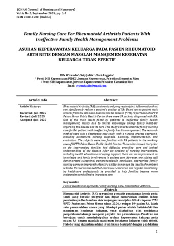 Rheumatoid Arthritis (RA) merupakan penyakit peradangan kronis pada sendi yang bersifat progresif dan dapat menurunkan kualitas hidup penderitanya. Berdasarkan data kunjungan rawat jalan di buku laporan PTM UPTD Puskesmas Pekan Heran tahun 2024, terdapat 59 pasien RA. Salah satu permasalahan utama yang dihadapi pasien adalah ketidakefektifan manajemen kesehatan keluarga, yang disebabkan oleh rendahnya pengetahuan keluarga mengenai penyakit dan perawatannya. Penelitian ini bertujuan untuk mendeskripsikan asuhan keperawatan keluarga pada pasien RA dengan masalah manajemen kesehatan keluarga tidak efektif. Metode yang digunakan adalah studi kasus deskriptif dengan pendekatan proses keperawatan yang mencakup pengkajian, diagnosis, perencanaan, implementasi, dan evaluasi. Subjek penelitian adalah dua keluarga dengan anggota yang menderita RA di wilayah kerja UPTD Puskesmas Pekan Heran. Hasil penelitian menunjukkan bahwa sebelum dilakukan intervensi, keluarga mengalami kesulitan dalam menjalankan perawatan dan tidak memahami kondisi penyakit. Setelah dilakukan intervensi berupa edukasi kesehatan dan dukungan koping keluarga selama enam kali pertemuan, terjadi peningkatan pengetahuan dan keterlibatan keluarga dalam perawatan anggota yang sakit, meskipun pada salah satu subjek, pemahaman masih belum optimal. Kesimpulan dari penelitian ini adalah bahwa asuhan keperawatan keluarga yang tepat dapat membantu meningkatkan kemampuan keluarga dalam mengelola kesehatan anggota yang menderita RA. Saran yang diberikan adalah perlunya pelatihan berkelanjutan dan pemantauan rutin oleh tenaga kesehatan agar keluarga dapat lebih mandiri dan efektif dalam merawat pasien RA.