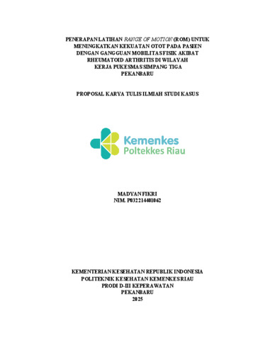 Madyan Fikri, P032214401062 (2025) PENERAPAN LATIHAN RANGE OF MOTION (ROM) UNTUK MENINGKATKAN KEKUATAN OTOT PADA PASIEN DENGAN GANGGUAN MOBILITAS FISIK AKIBAT RHEUMATOID ARTHRITIS DI WILAYAH KERJA PUKESMAS SIMPANG TIGA PEKANBARU. Diploma thesis, Poltekkes Kemenkes Riau.