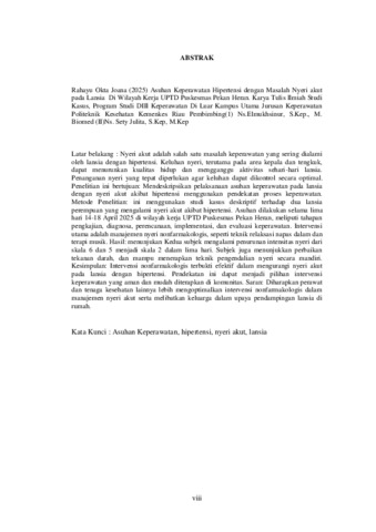 | Uncontrolled Keywords: | Asuhan Keperawatan, hipertensi, nyeri akut, lansia |